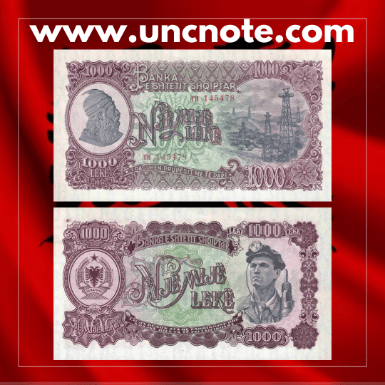Issued by the State Bank of Albania in 1957, this 1,000 Leke banknote belongs to the socialist-era currency series circulated during the early years of the People’s Socialist Republic of Albania. The note reflects the ideological themes and national identity promoted during the communist period.