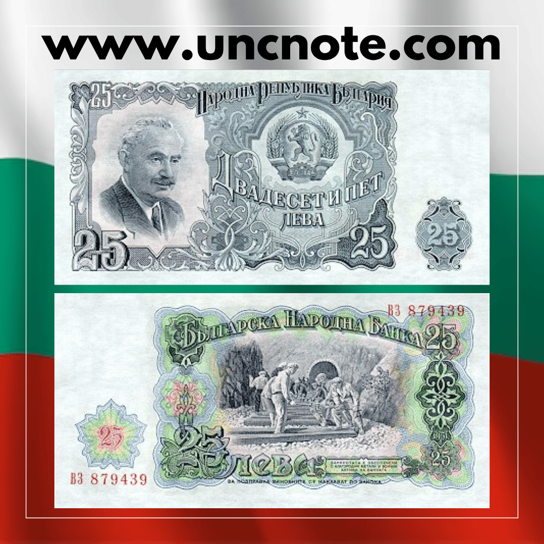Issued in 1951 by the National Bank of Bulgaria during the Second Lev period, this 25 Leva note features on the obverse a portrait of Georgi Dimitrov, the country’s leader at the time, alongside the Bulgarian coat of arms and the denomination “25 Лева”. The reverse depicts a scene with a youth railway brigade, reflecting post-war industrial efforts. The note is printed on cotton-based paper with gray-blue tones and measures 145 × 76 mm.