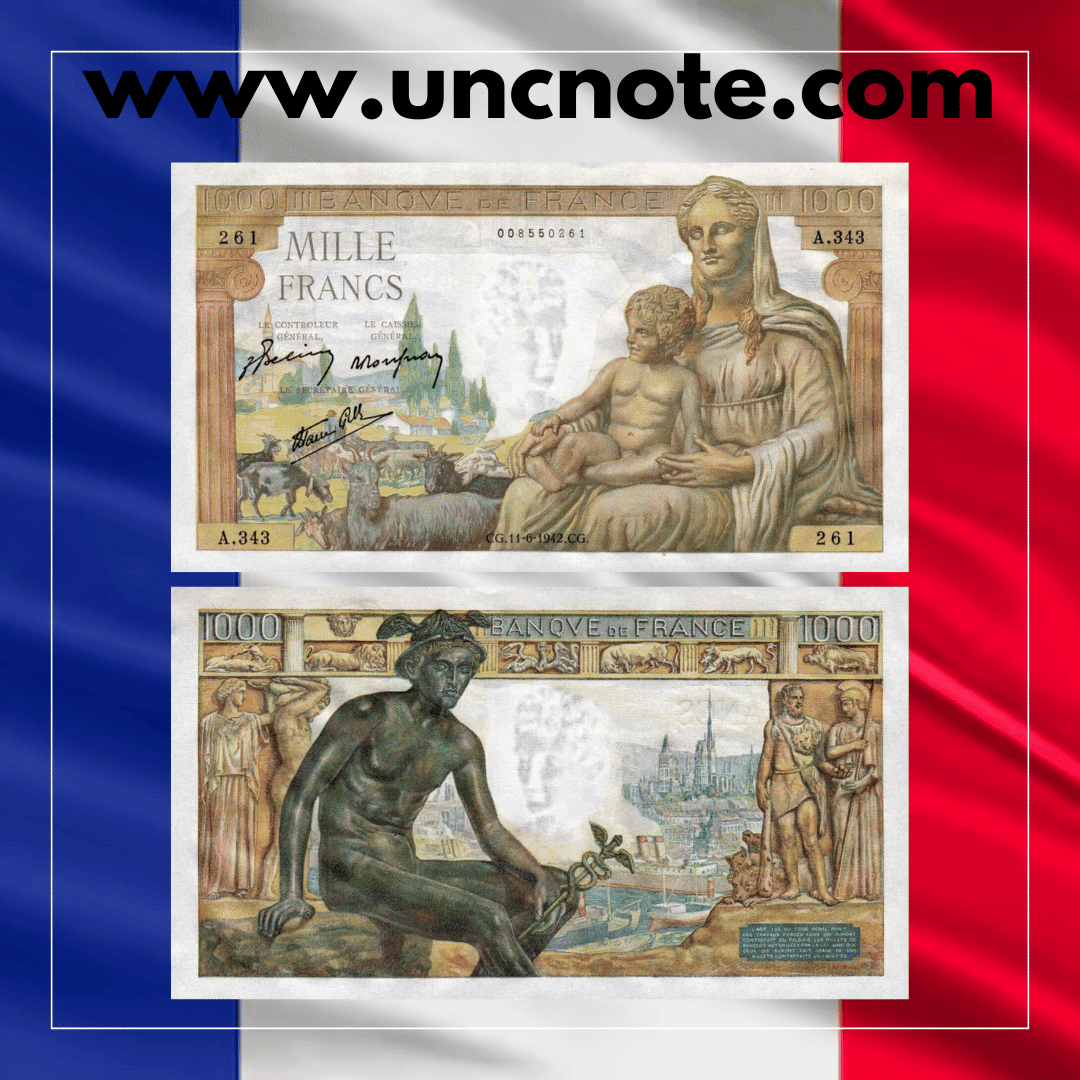 The France 1000 Francs 1942 UNC banknote is a premium addition for collectors seeking historical depth, rarity, and artistic quality. Its high denomination and wartime context make it especially desirable.