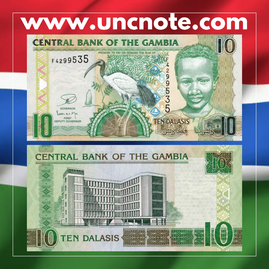 The Gambia 10 Dalasis 2013 UNC banknote is an authentic piece of world paper money offered in uncirculated condition, carefully selected for collectors of international banknotes.