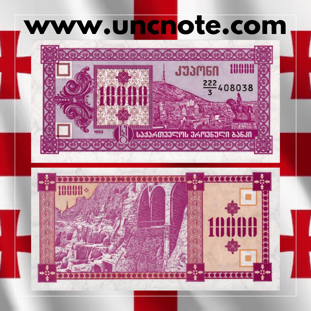 The 10,000 Lari 1993 banknote belongs to the Georgian Kuponi series, issued between 1993 and 1995 during a period of severe hyperinflation. These emergency issues replaced the Soviet ruble after independence but were rapidly devalued, leading to the introduction of high denominations such as this one.