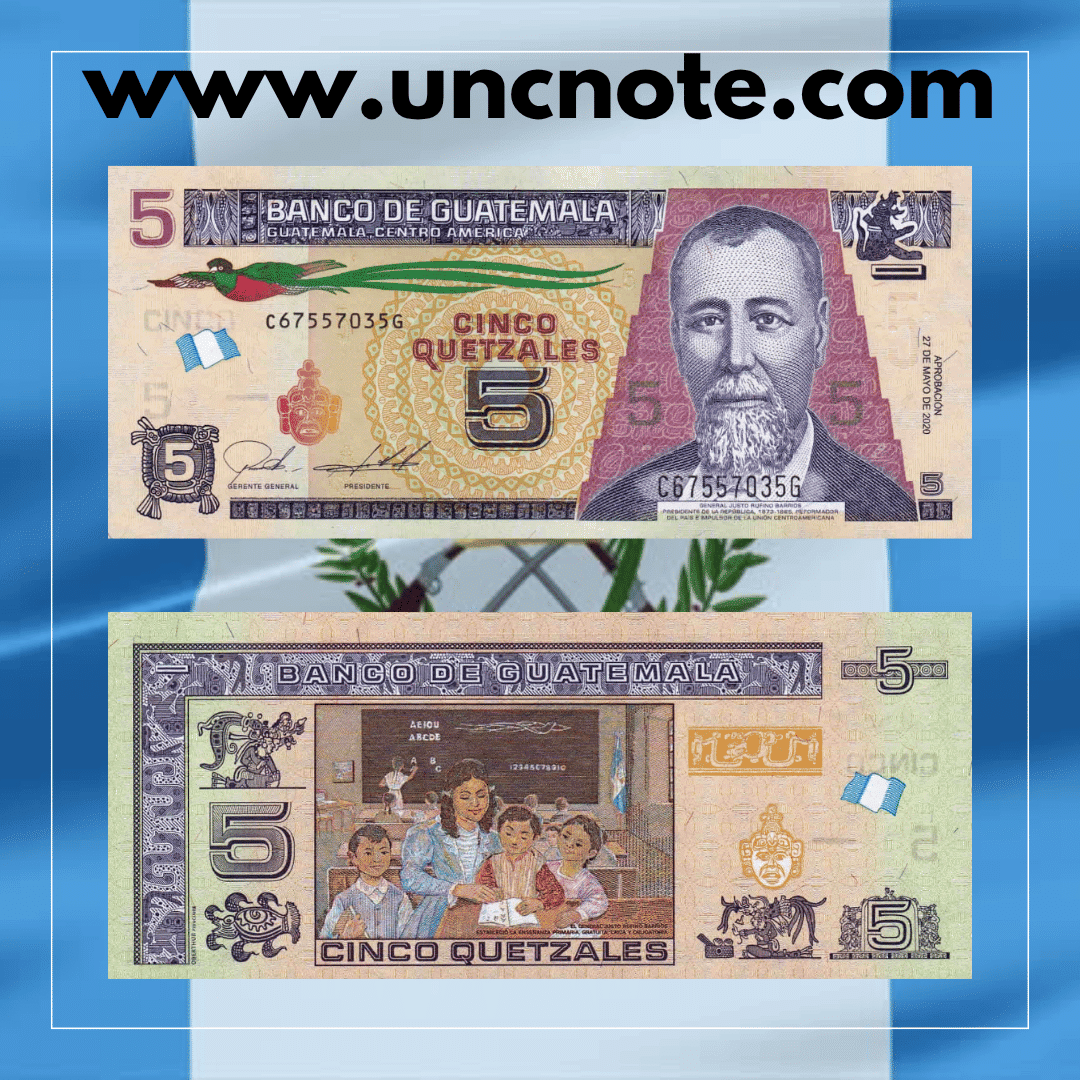The Guatemala 5 Quetzales 2020 UNC banknote is an authentic piece of world paper money offered in uncirculated condition, carefully selected for collectors of international banknotes.