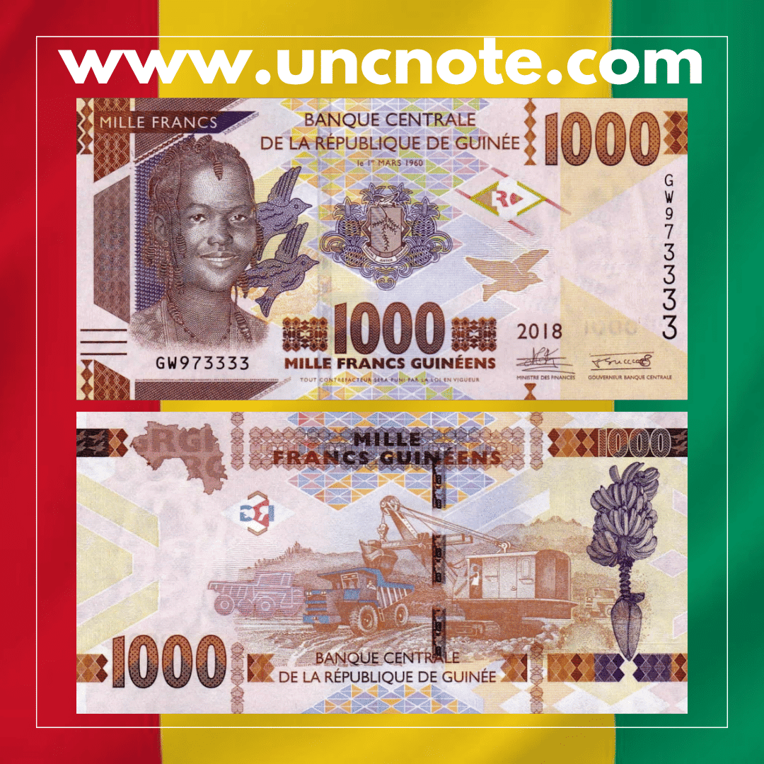 The Guinea 1000 Francs 2018 UNC banknote is an authentic piece of world paper money offered in uncirculated condition, carefully selected for collectors of international banknotes.