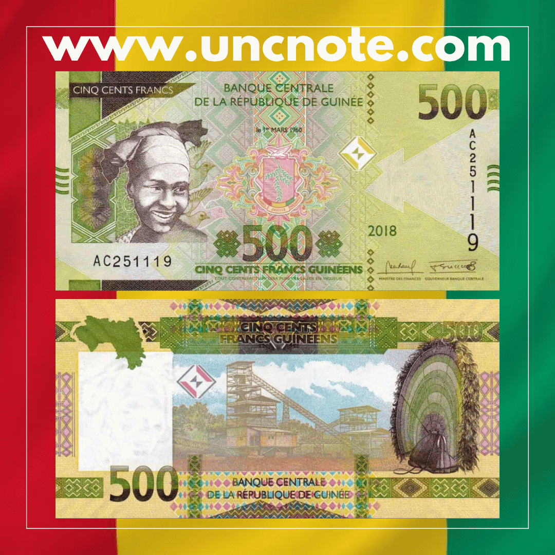 Issued by the Banque Centrale de la République de Guinée in 2018, this 500 Francs banknote belongs to the updated Guinean Franc (GNF) series, designed with enhanced durability and modernized security features.