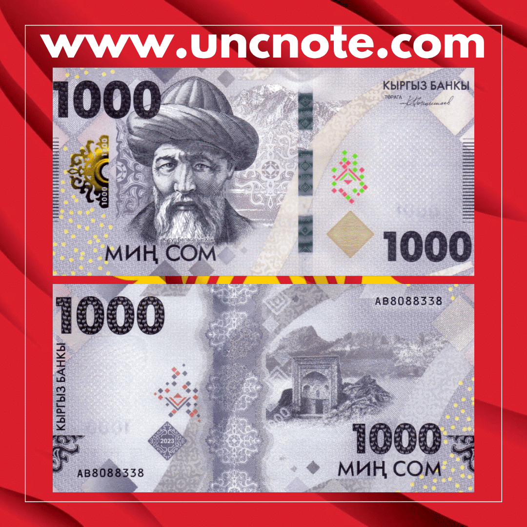 Issued by the National Bank of the Kyrgyz Republic in 2023, this 1,000 Som banknote is part of the latest series emphasizing Kyrgyzstan’s national identity, cultural heritage, and modern security features.