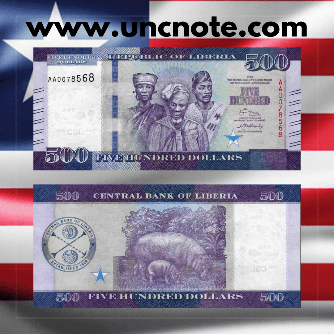 Issued by the Central Bank of Liberia in 2016, this 500 Dollars banknote is part of the modern series highlighting Liberia’s national leaders, cultural heritage, and financial institutions.