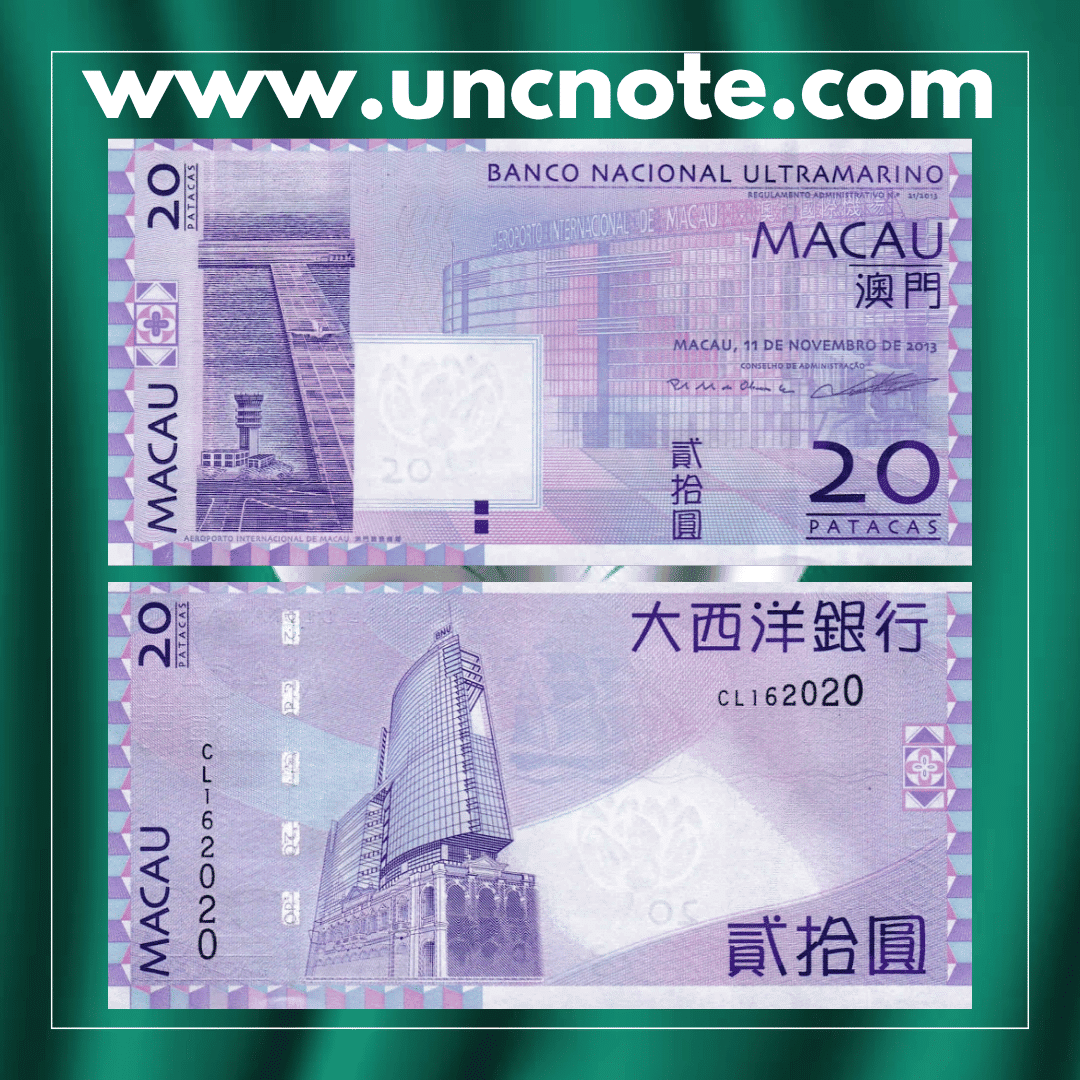 Issued by the Banco Nacional Ultramarino (BNU) in 2013, this 20 Patacas banknote is part of Macao’s modern series celebrating its cultural heritage and historical landmarks.