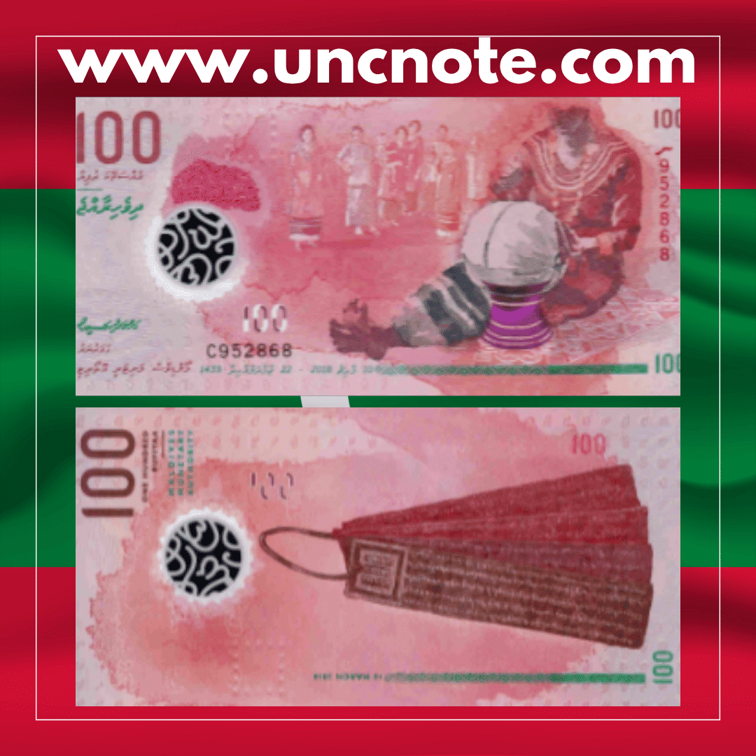 Issued by the Maldives Monetary Authority (MMA) in 2024, this 100 Rufiyaa banknote is part of the modern series emphasizing the Maldives’ culture, heritage, and natural environment.