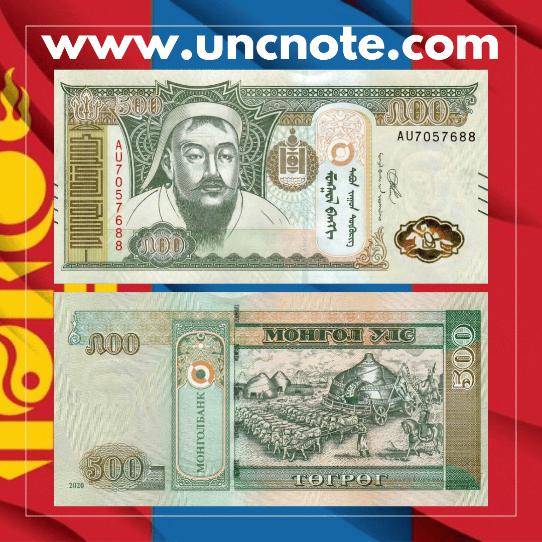 Issued by the Bank of Mongolia in 2020, this 500 Tugrik banknote is part of the modern series emphasizing Mongolia’s national identity, cultural heritage, and historical symbols.