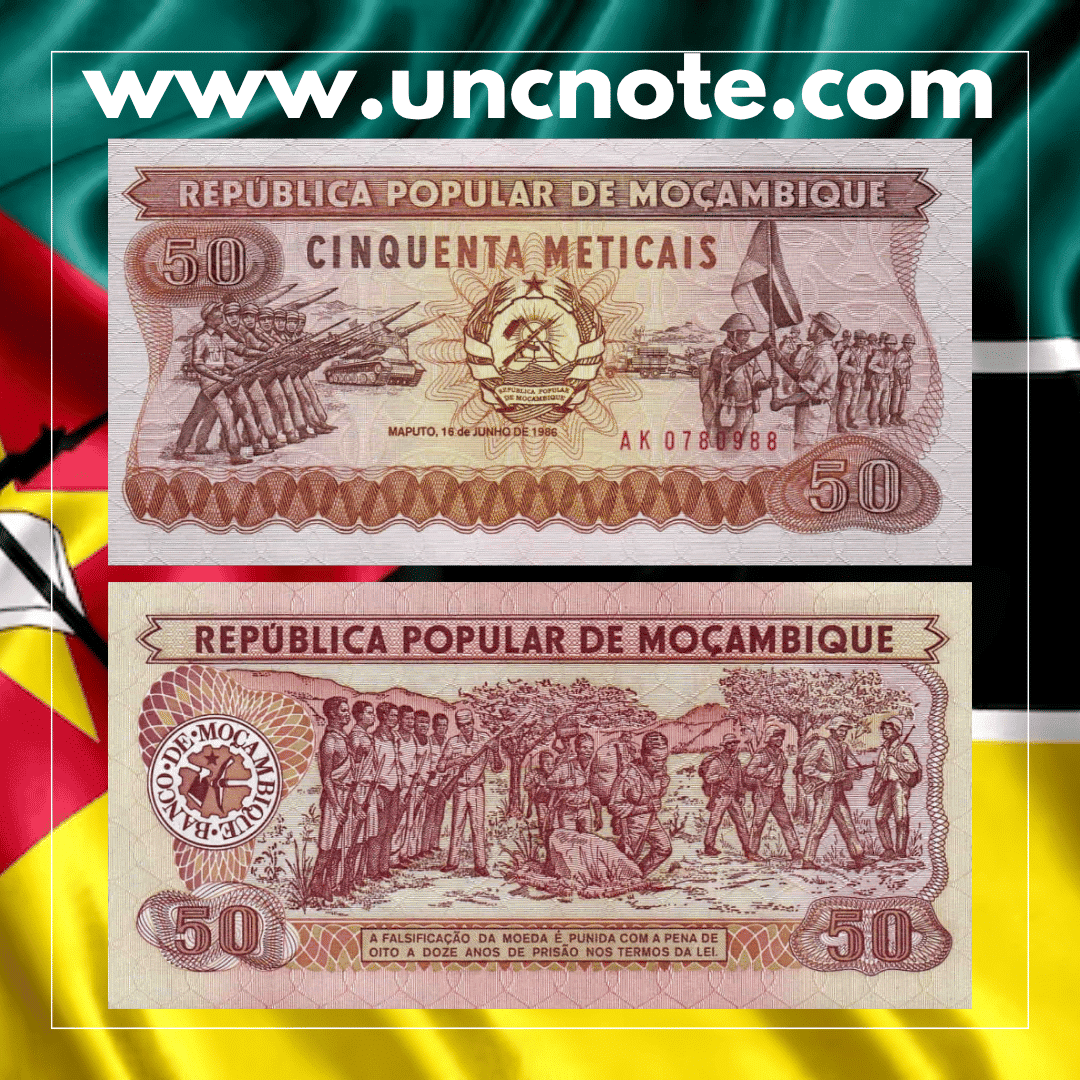 Issued by the Banco de Moçambique in 1986, this 50 Meticais banknote is part of the post-independence series highlighting Mozambique’s national identity, culture, and economic development.