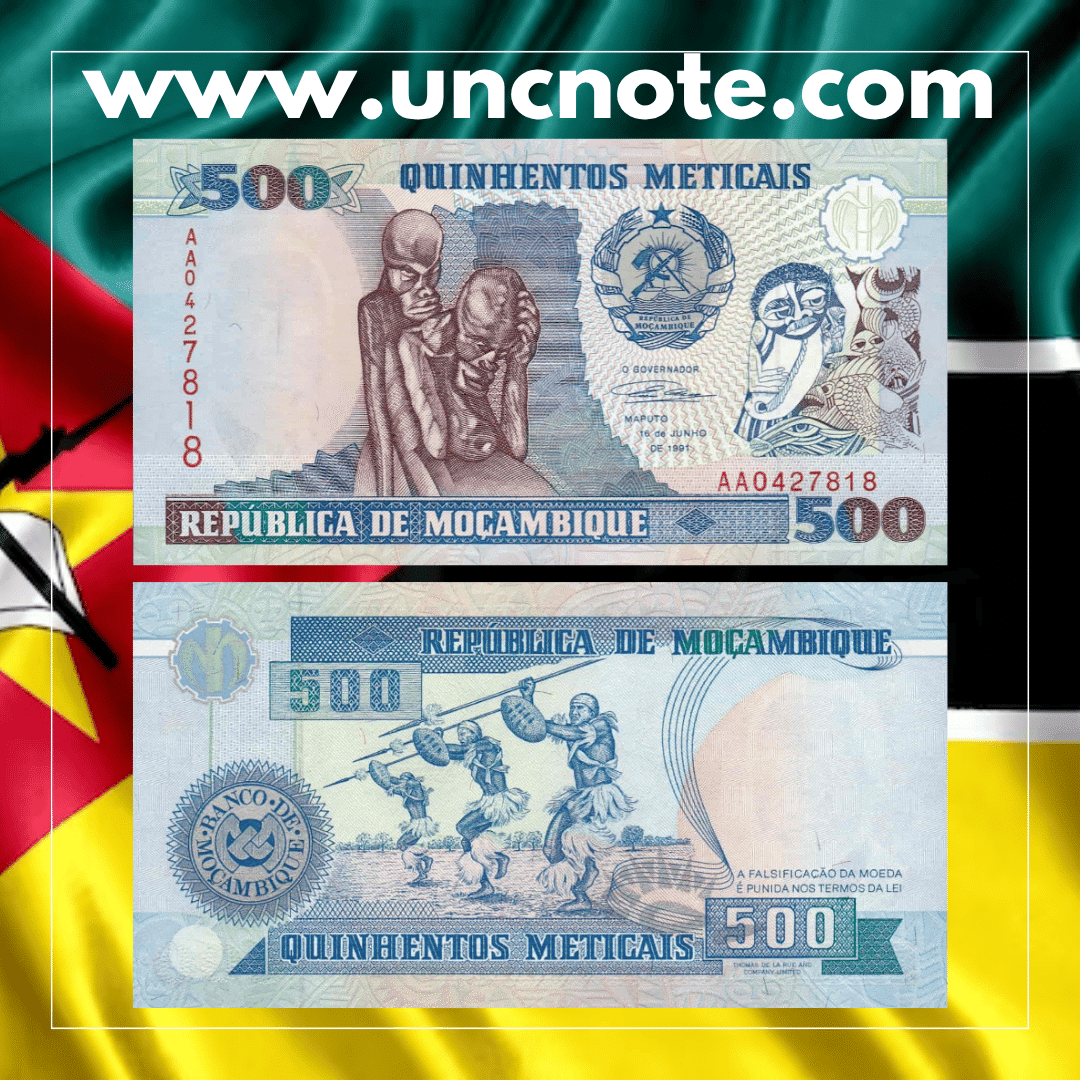 Issued by the Banco de Moçambique in 1991, this 500 Meticais banknote is part of the post-independence series highlighting Mozambique’s national identity, cultural heritage, and economic development.