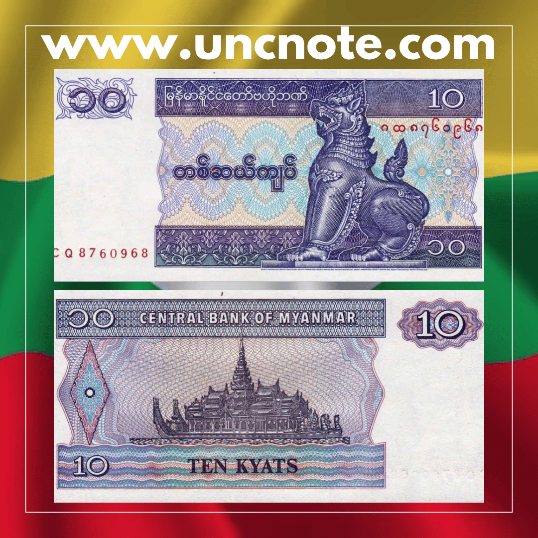 Issued by the Central Bank of Myanmar in 1995, this 10 Kyats banknote is part of the series highlighting Myanmar’s cultural heritage and national symbols.