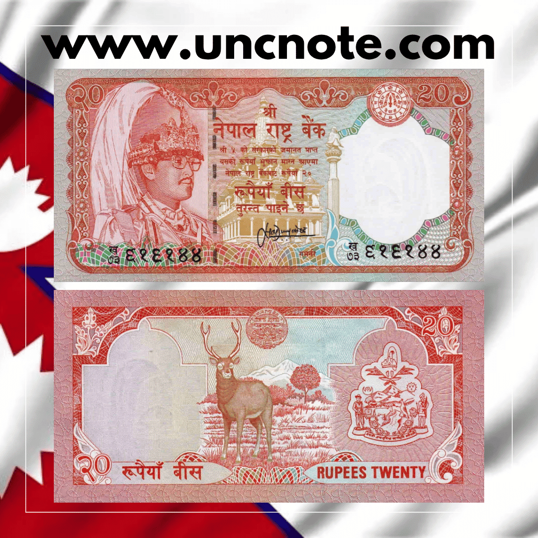 Issued by the Nepal Rastra Bank in 1995, this 20 Rupees banknote is part of the series highlighting Nepal’s monarchy, cultural identity, and natural heritage.