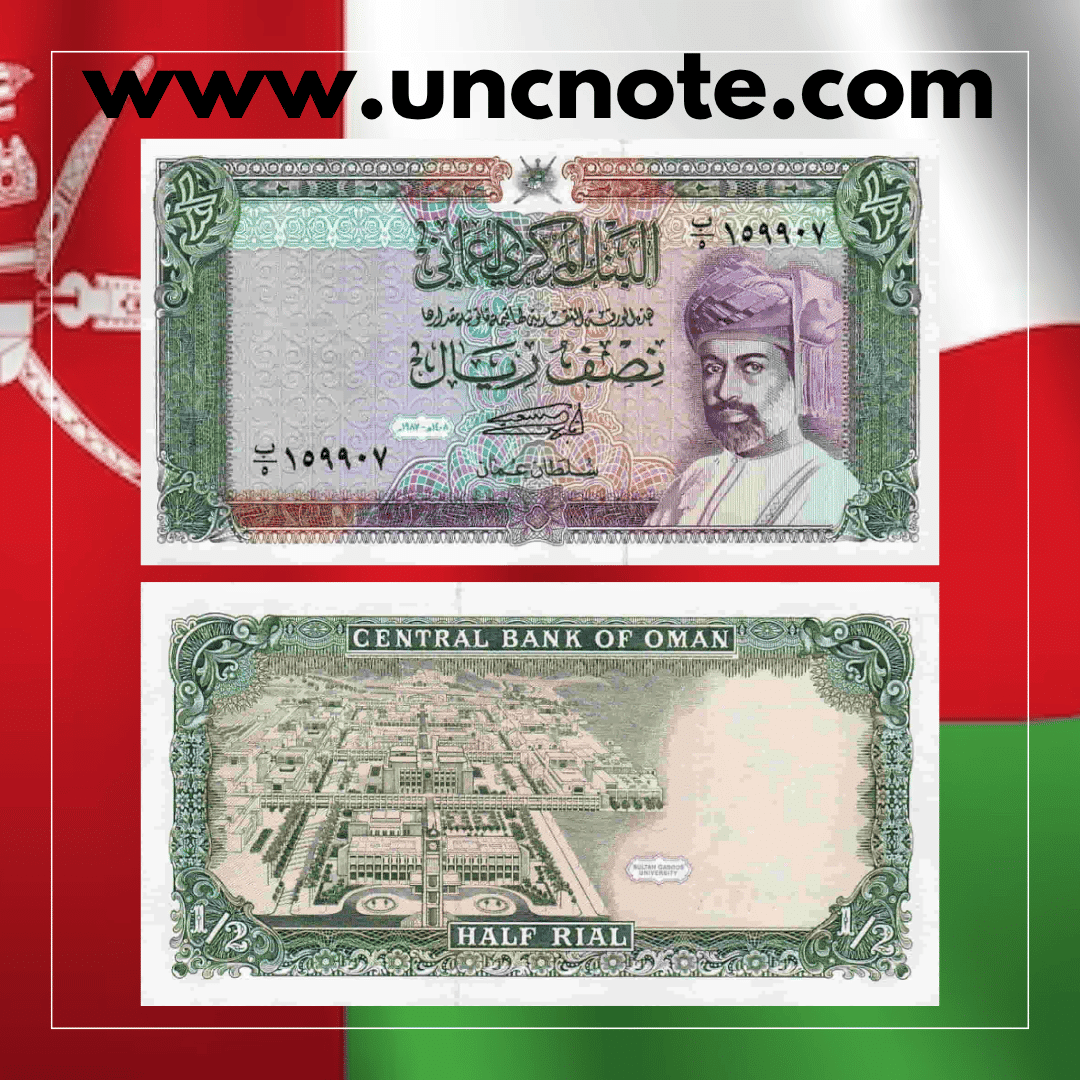 The Oman 1/2 Rial 1987 UNC banknote is an authentic piece of world paper money offered in uncirculated condition, carefully selected for collectors of international banknotes.