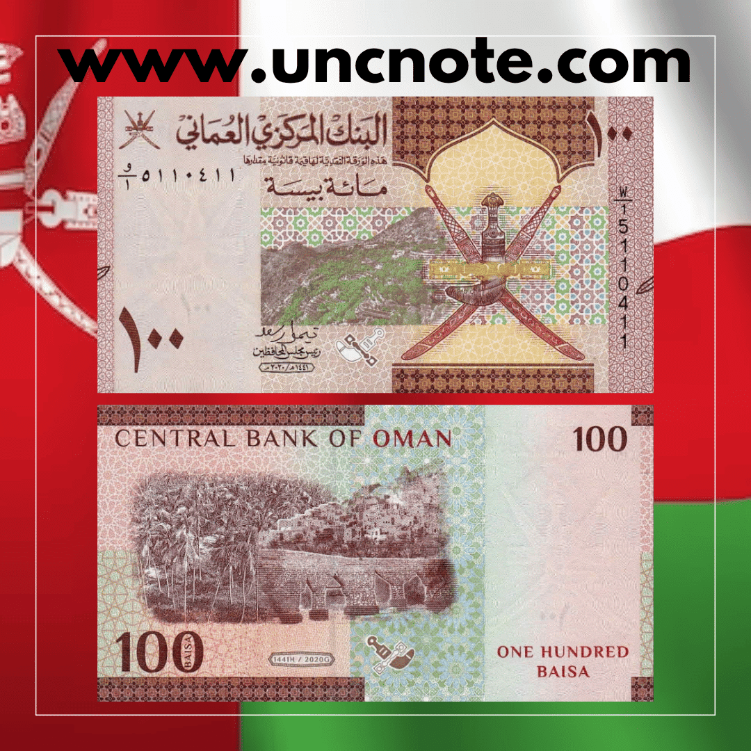 Issued by the Central Bank of Oman in 2020, this 100 Baisa banknote is part of the modern series emphasizing Oman’s national identity, heritage, and cultural symbols.