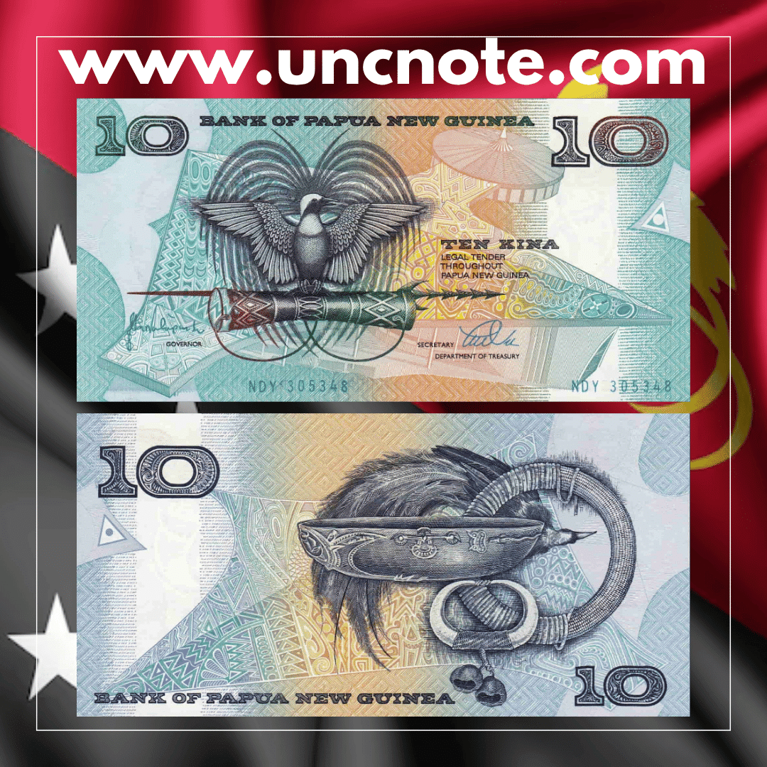 The obverse features a bird of paradise, Papua New Guinea’s national symbol, accompanied by denomination numerals, English inscriptions, and intricate guilloche patterns.