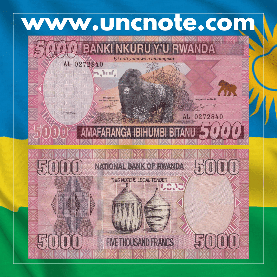 Issued by the National Bank of Rwanda in 2014, this 5000 Francs banknote is part of the modern high-denomination series, reflecting Rwanda’s economic development and enhanced security standards.