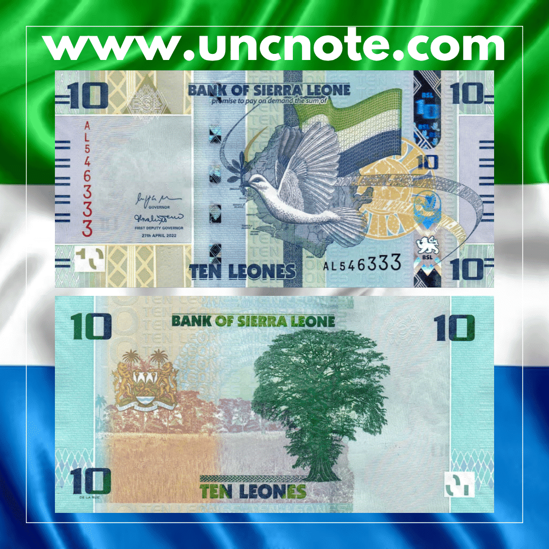 Issued by the Bank of Sierra Leone in 2022, this 10 Leones banknote is part of the modern series emphasizing the nation’s cultural heritage, national identity, and enhanced security features.