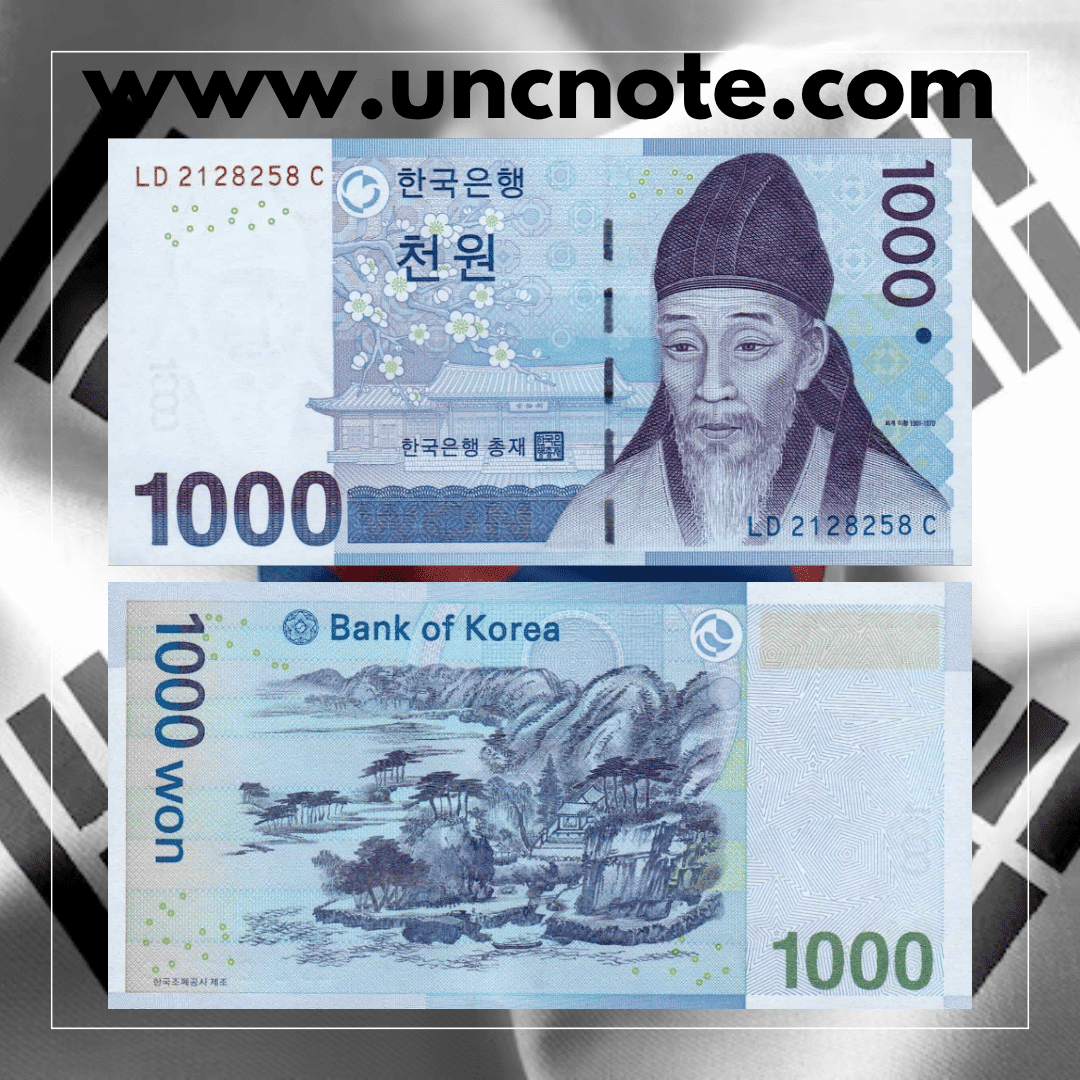 Issued by the Bank of Korea in 2007, this 1000 Won banknote features the portrait of Yi Hwang, a prominent Korean Confucian scholar, on the obverse. The design includes intricate patterns, microtext, and modern anti-counterfeiting elements.