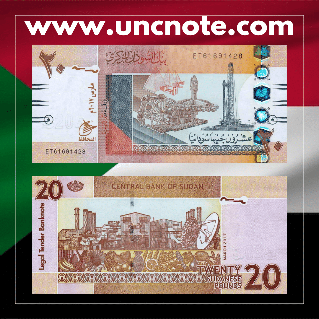 Issued by the Central Bank of Sudan in 2017, this 20 Pounds banknote is part of the modern series highlighting the country’s cultural heritage and national identity.