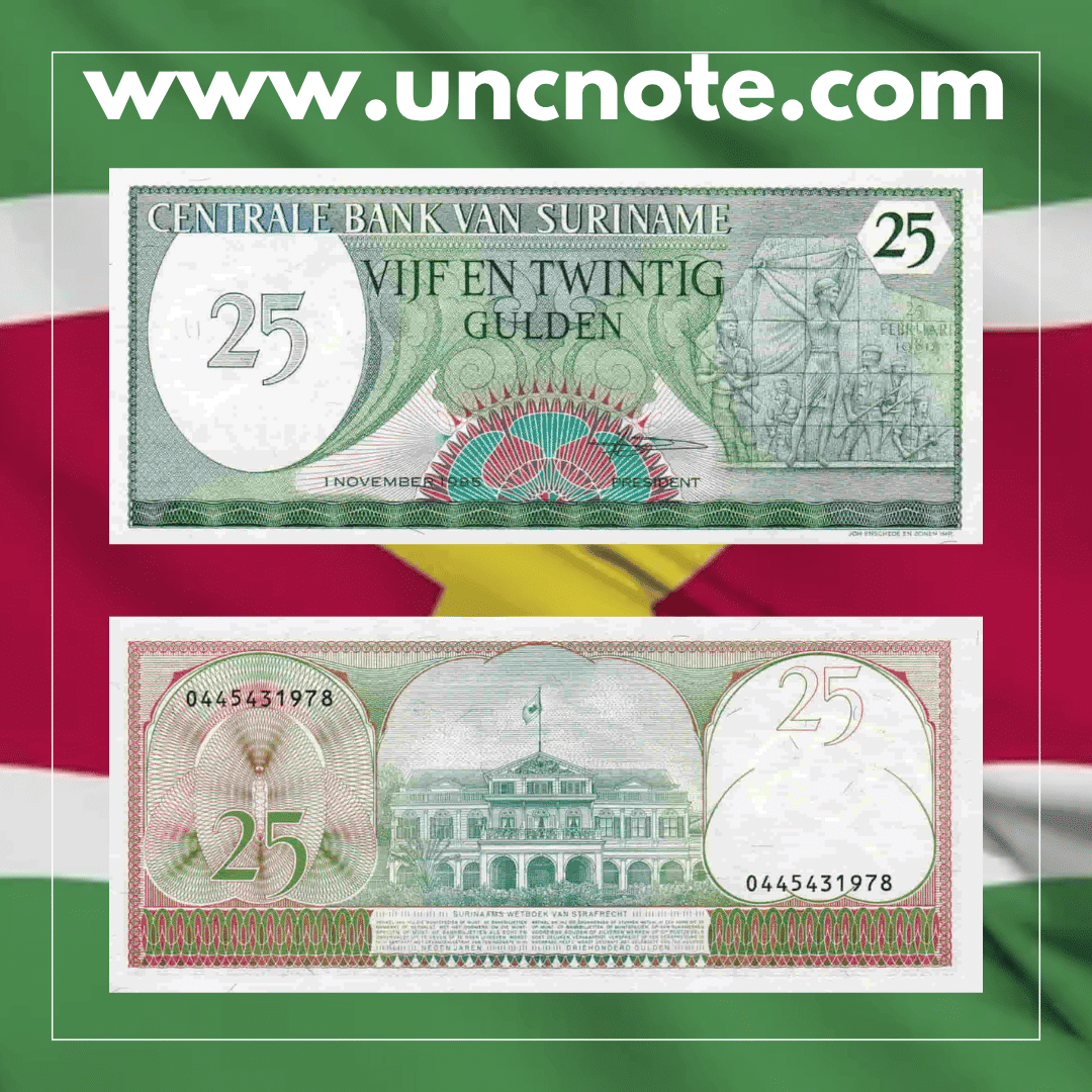 The Suriname 25 Gulden 1985 UNC banknote is an authentic piece of world paper money offered in uncirculated condition, carefully selected for collectors of international banknotes.