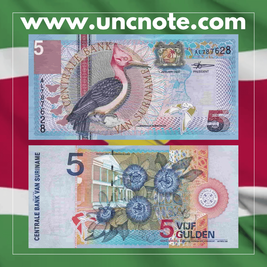 Issued by the Central Bank of Suriname in 2000, this 5 Gulden banknote is part of the modern series reflecting the country’s cultural heritage, national identity, and economic history.