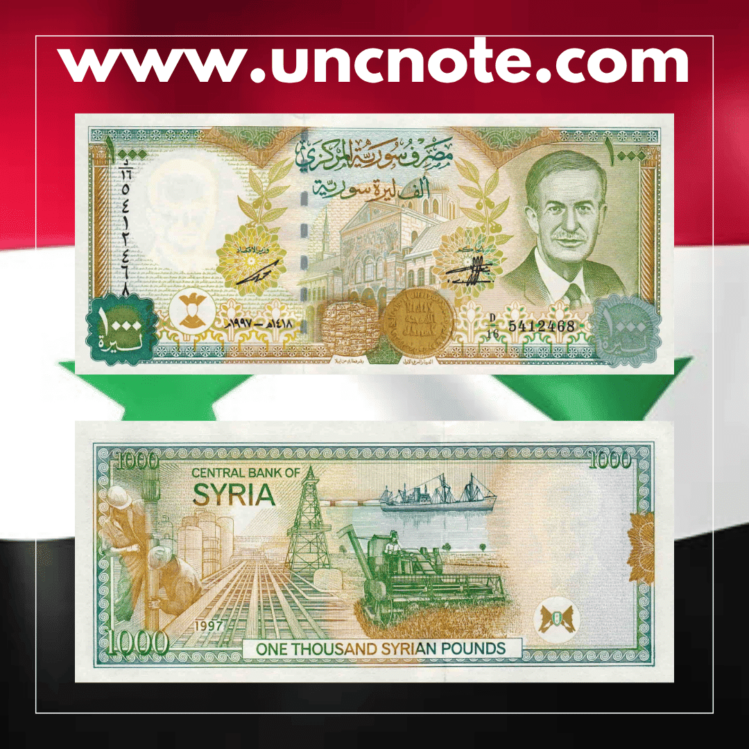 Issued by the Central Bank of Syria in 1997, this 1,000 Pounds banknote is part of the modern series highlighting Syria’s cultural heritage and national identity.