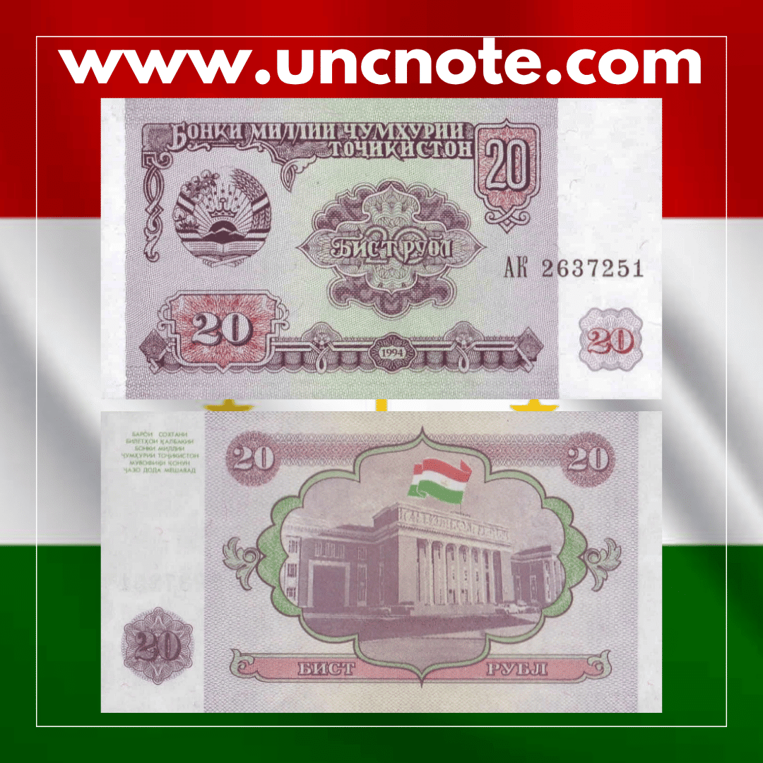 Issued by the National Bank of Tajikistan in 1994, this 20 Rublos banknote is part of the early post-independence series issued before the introduction of the somoni.