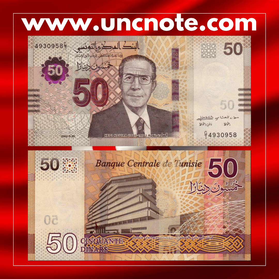 Issued by the Central Bank of Tunisia in 2022, this 50 Dinars banknote is part of the latest modern series, featuring updated security elements and contemporary design. The note reflects Tunisia’s cultural heritage, national landmarks, and modern identity, while incorporating advanced anti-counterfeiting measures.