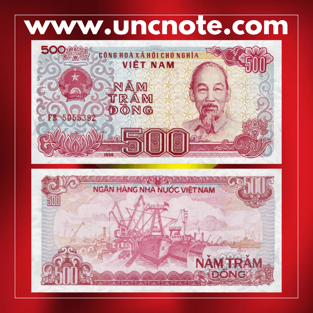 Issued by the State Bank of Vietnam in 1988, this 500 Dong banknote forms part of the late-1980s series introduced during the early years of the Đổi Mới economic reforms. It reflects Vietnam’s focus on industrial growth and national development.