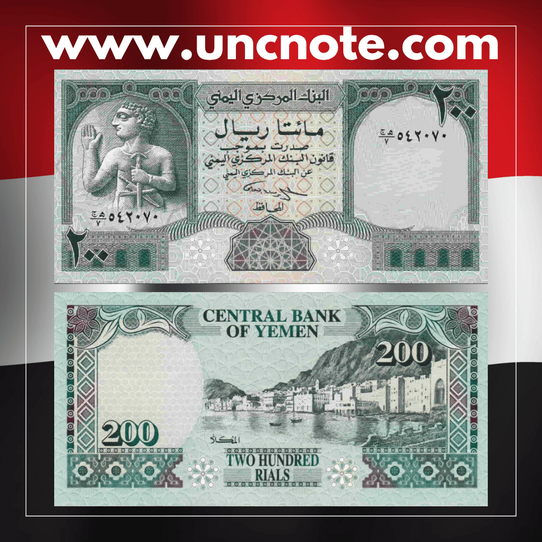 Issued by the Central Bank of Yemen in 1996, this 200 Rials banknote is part of the post-unification series reflecting Yemen’s national identity, heritage, and economic stability following the 1990 unification of North and South Yemen.
